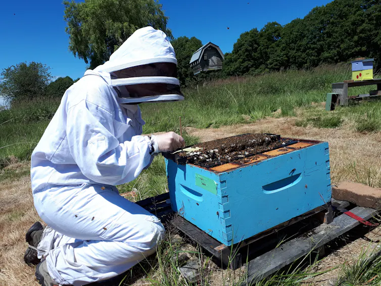 Sampling honey from hives to test for environmental pollutants. Kate Smith, Author provided